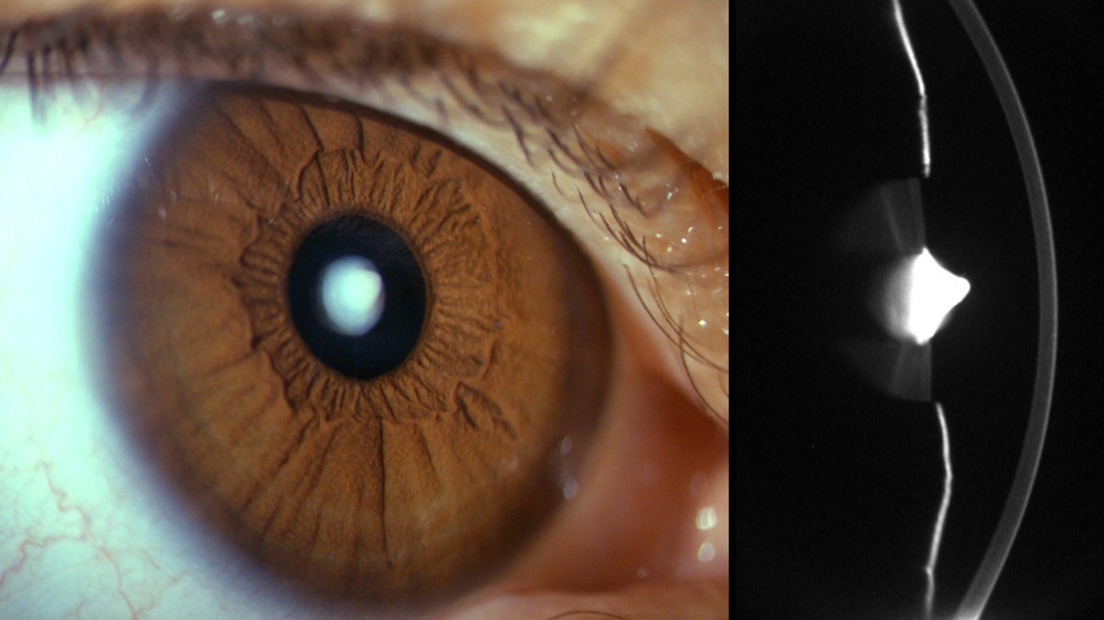 Descrição: Slit-lamp photograph and Scheimpflug imaging of an anterior polar pyramidal cataract.