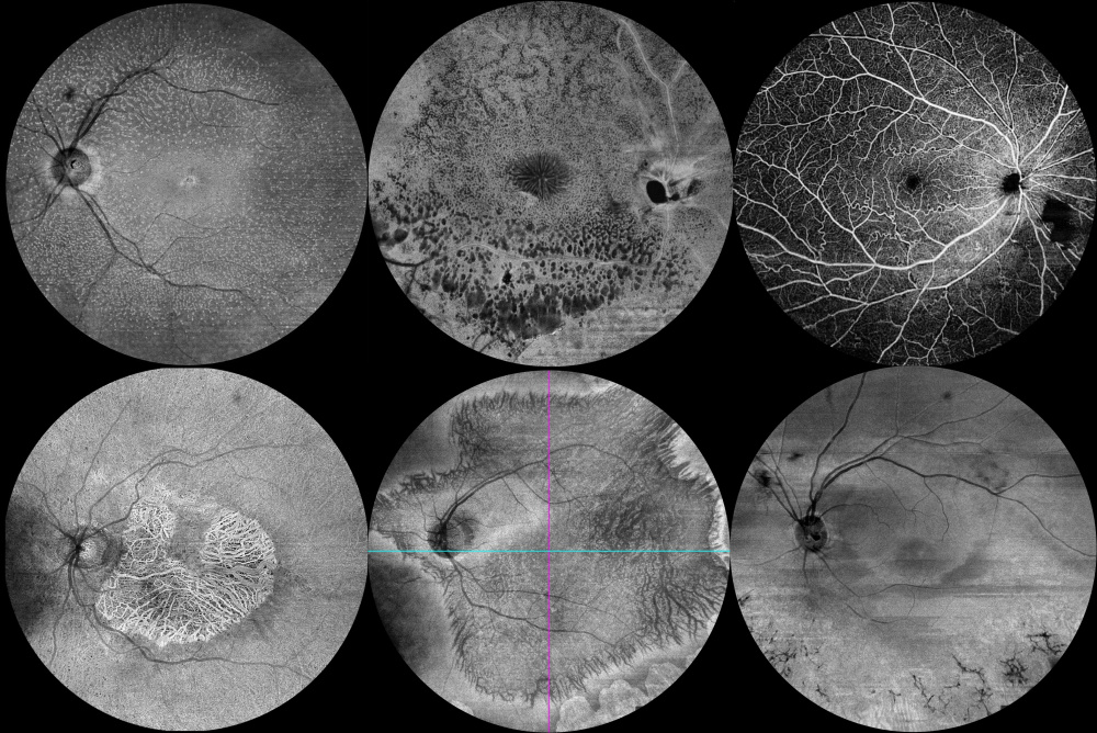 Descrição: These images illustrate a spectrum of inherited retinal diseases (IRD) captured with en face optical coherence tomography (OCT) and optical coherence tomography angiography (OCT-A). Top row, left to right: fundus albipunctatus (RDH5), X-linked retinoschisis (RS1), and familial retinal arteriolar tortuosity (COL4A1). Bottom row, left to right: maternally inherited diabetes and deafness (MT-TL1), gyrate atrophy of the choroid and retina (OAT), and sector retinitis pigmentosa (RHO).