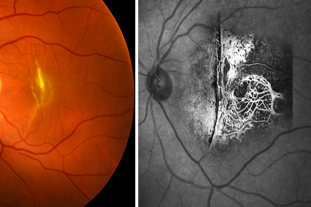 Descrição: Secondary Neovascularization Following Post-Traumatic Choroidal Rupture