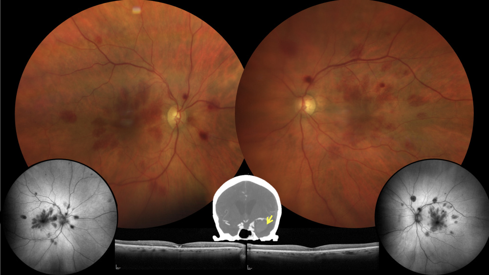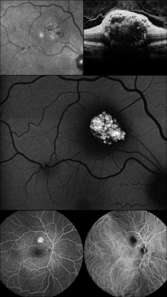 Descrição: Hemorragia na camada de fibras de Henle no síndrome de Terson. Retinografia demonstrando múltiplas hemorragias intraretinianas petalóides a irradiar a partir da fóvea, bilateralmente. A morfologia floral é melhor evidenciada na autofluorescência. A tomografia de coerência óptica revela depósito hiperrefletivo foveal e no trajeto oblíquo delineado pelas fibras de Henle, correspondente às hemorragias radiárias.