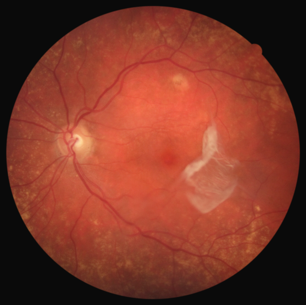 Descrição: Large mobile vitreous opacity over the macular area, partially involving the visual axis, with attached retina and scattered extramacular drusen