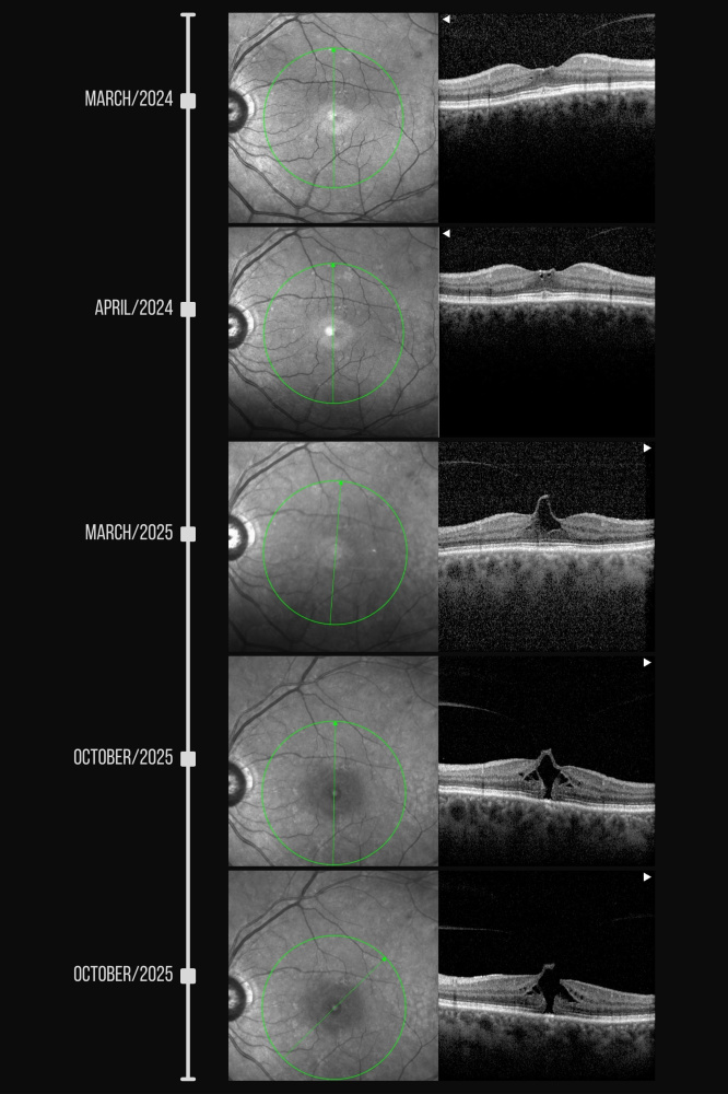 Descrição: This case illustrates the progressive course of vitreomacular traction syndrome, with initial optical coherence tomography revealing subtle focal vitreomacular traction that ultimately culminated in a full-thickness macular hole.