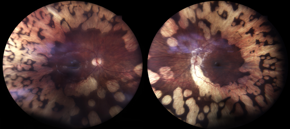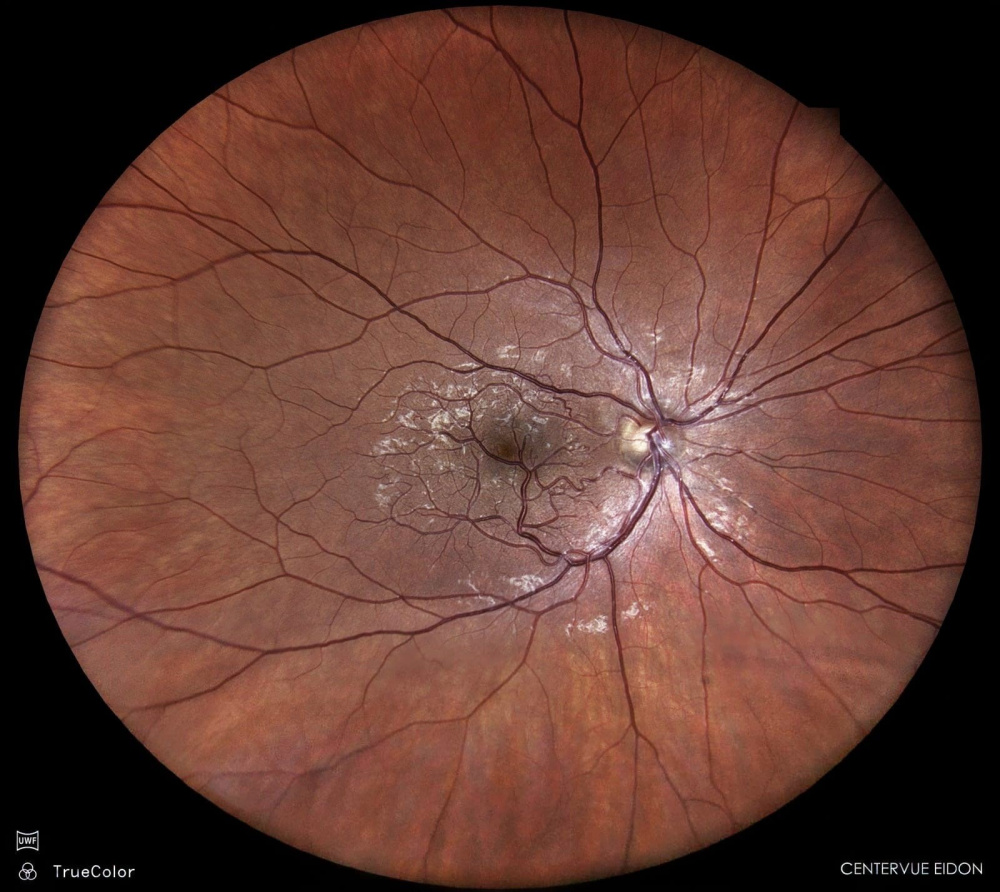 Descrição: Retinografia com padrão típico de atrofia girata em criança de 5 anos, assintomática, apenas com rastreio visual infantil positivo.