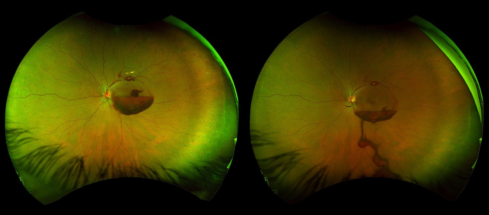 Descrição: Ultra-widefield fundus photographs demonstrating a premacular hemorrhage before (left) and after (right) Nd:YAG laser posterior hyaloidotomy.