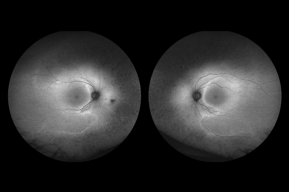 Descrição: Ultra-wide-field fundus autofluorescence (UWF-FAF) imaging showing an atypical retinitis pigmentosa (RP) phenotype in a patient with a CNGB1 variant.