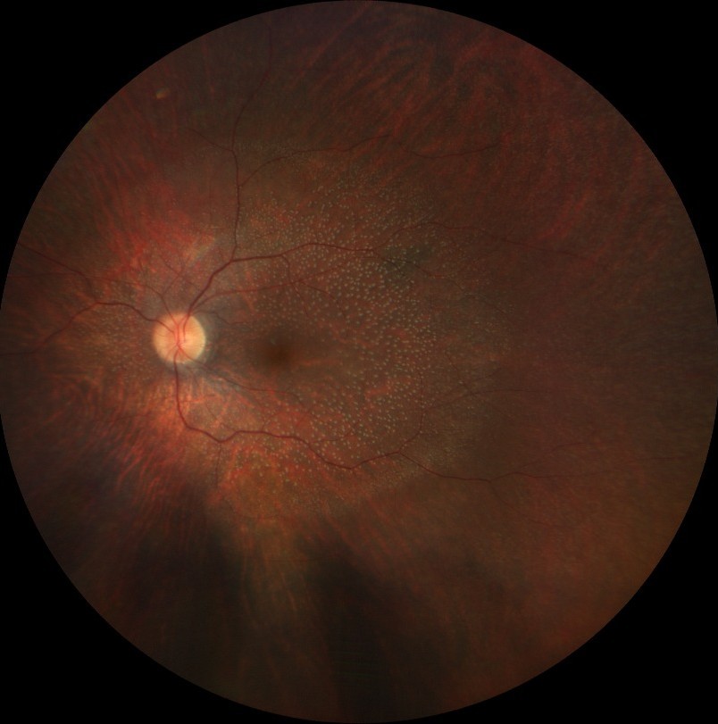 Descrição: Color fundus photograph of a patient with retinitis punctata albescens